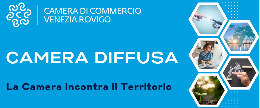 La Camera di Commercio di Venezia Rovigo è lieta di presentare "Camera Diffusa", una rassegna di appuntamenti dedicati a imprese e cittadini, pensati per avvicinare l'Ente al territorio e promuovere una conoscenza più capillare dei servizi camerali a supporto dello sviluppo economico locale.