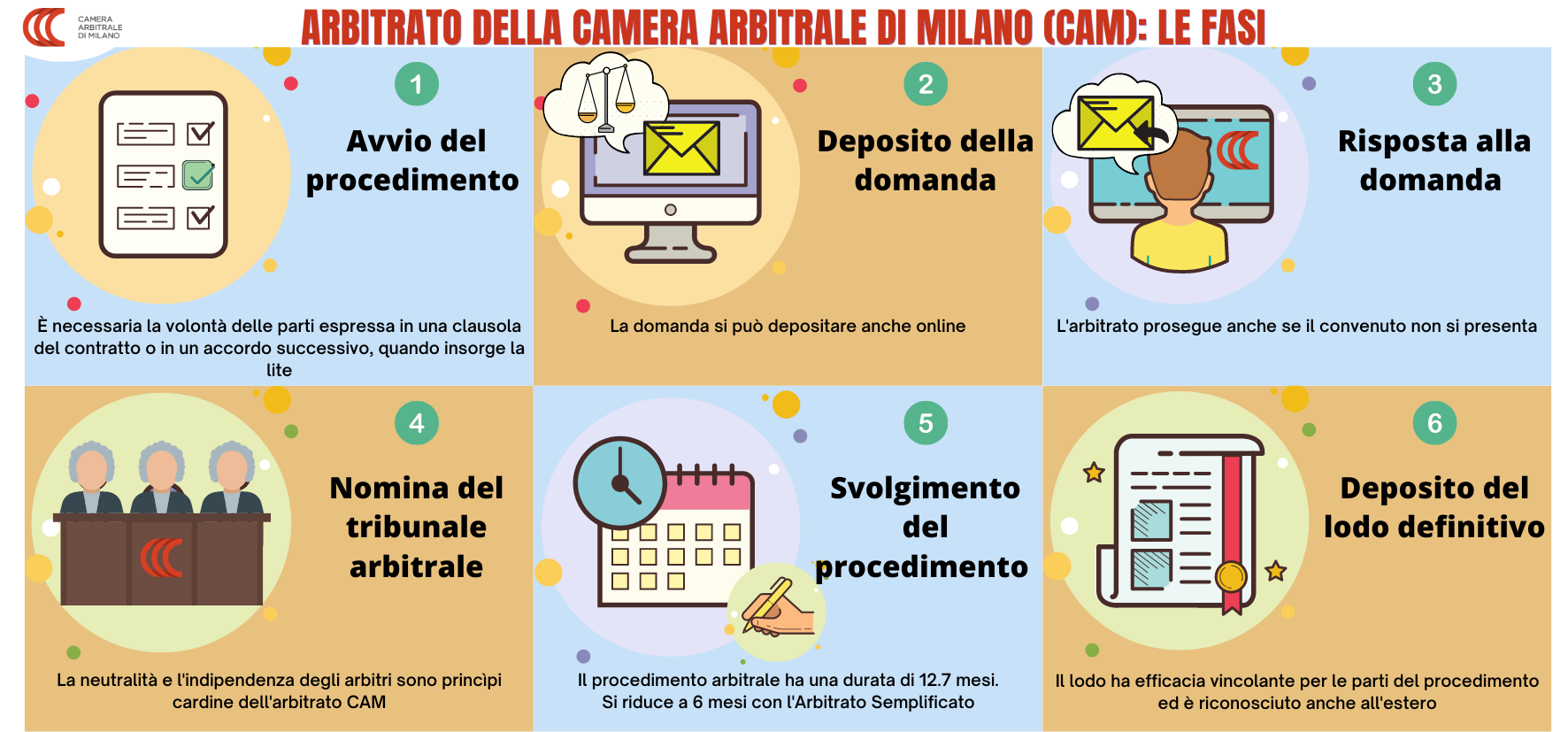 Tempi. Con l’arbitrato CAM la decisione sulle controversie, in media, si ottiene in 12.7 mesi (media degli ultimi 5 anni). Il tempo di conclusione del procedimento arbitrale si riduce del 56% (pari a 170 giorni) in caso si applichi la procedura semplificata. L’arbitrato semplificato nato in CAM nel 2020 si applica ai procedimenti il cui valore della domanda non superi 250 mila euro, fatta salva la contrarietà di una parte; si applica inoltre a tutti i procedimenti senza alcun limite di valore economico, se le parti vi abbiano fatto riferimento nella clausola arbitrale o se ne abbiano concordato l’applicazione anche successivamente.